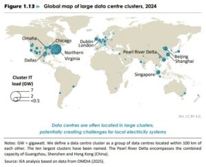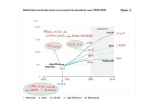 No hay inteligencia artificial sin energía: el año 2024 los data centers consumieron globalmente 415 TWh de electricidad – Chile en su totalidad consumió 79.5 TWh en igual período -. Al año 2030 el escenario base de la Agencia de Energía Internacional (IEA) proyecta un consumo de 945 TWh, más del doble del anterior y que vistas las inversiones en curso, probablemente se quede corto … La capacidad instalada mundial de data centers al año 2024 era de 97 GW – la chilena, irrelevante, era de aproximadamente 200 MW o 0.2 GW -; para el año 2030 sería de 226 GW – la chilena, otro milagro de desarrollo es el que debería hacerse realidad -.