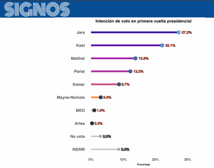 Jeannette Jara y José Antonio Kast irían a segunda vuelta en diciembre, según la encuesta Signos que elabora a nivel nacional la consultora Signos Analytics.